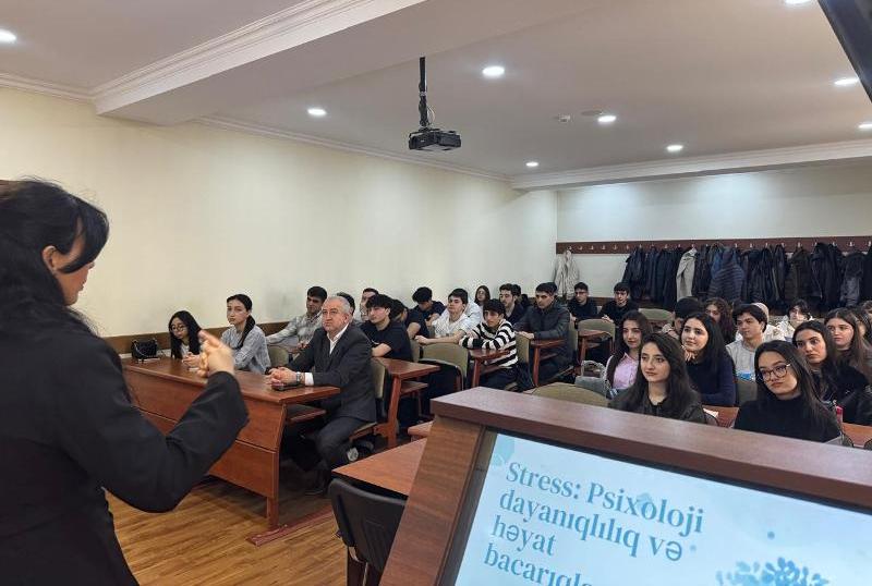 Tədbiri giriş sözü ilə fakültənin dekan müavini, dosent Elbrus Əkbərov açaraq, gənclərlə bu istiqamətdə maarifləndirici görüşlərin təşkilinin əhəmiyyətindən bəhs edib. O, psixoloji sağlamlığın qorunmasının tələbələrin həm akademik, həm də şəxsi inkişafında mühüm rol oynadığını vurğulayıb.