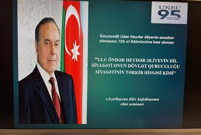 Azərbaycan Dövlət İqtisad Universitetinin (UNEC) “Azərbaycan dili” kafedrası Ümumi Fənlərin Tədrisinin Təşkili Departamenti (ÜFTTD) ilə birlikdə UNEC-in 95 illik yubileyi ərəfəsində “Ulu Öndər Heydər Əliyevin dil siyasəti onun dövlət quruculuğu siyasətinin tərkib hissəsi kimi” mövzusunda onlayn elmi seminar keçirib.