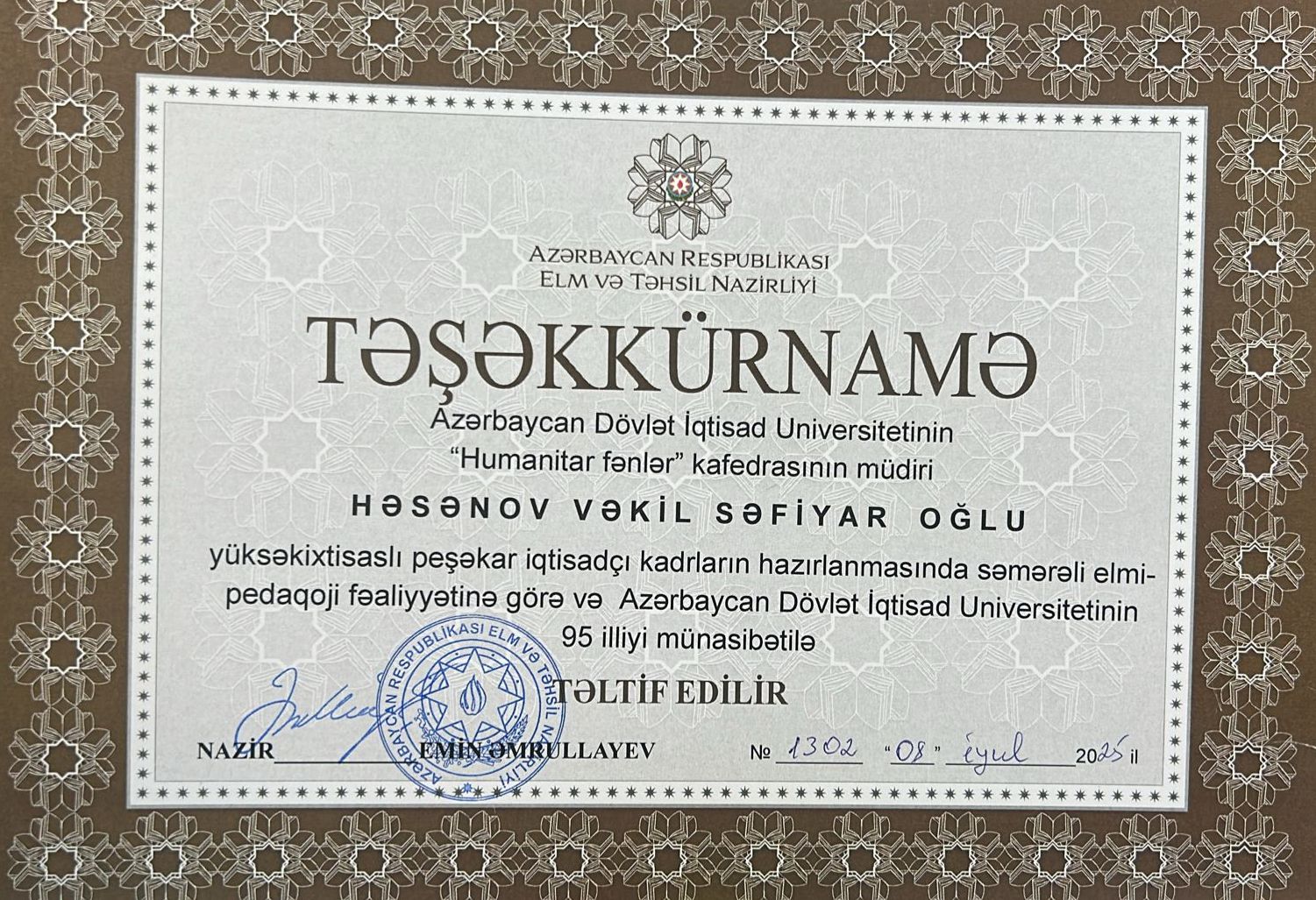 2025-ci ildə UNEC-in 95 illik yubileyi münasibətilə Azərbaycan Respublikası Elm və Təhsil Nazirinin əmri ilə “Təşəkkürnamə” ilə təltif olunmuşdur.